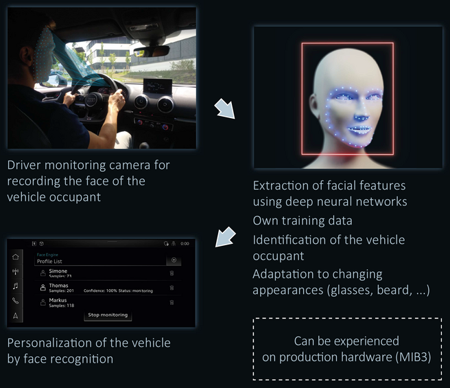 Machine learning is already being used in the latest vehicles to capture the environment or to monitor and control the interior. At e.solutions, we focus on what is known as the intelligent cockpit, which ranges from vehicle interaction using gestures or speech to distraction detection and personalization. For instance, settings such as seat position, mirrors or comfort temperature can be linked to individual drivers. Reliable driver recognition using facial features is just one of our many advanced development projects. Our team also develops algorithms for intelligent caller lists or smart seat heating based on individual user preferences.